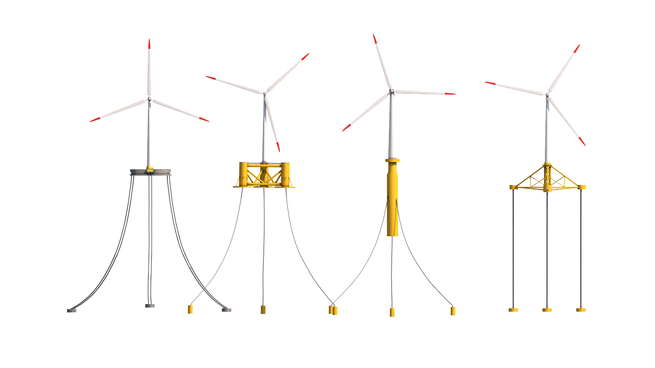 Es gibt vier verschiedene Technologien, die eine schwimmende Offshore-Windkraftanlage möglich machen. Die ersten drei sind lose auf dem Meeresboden verankert, während die Plattform mit Zugbeinen fester mit dem Meeresboden verbunden und stabiler ist.