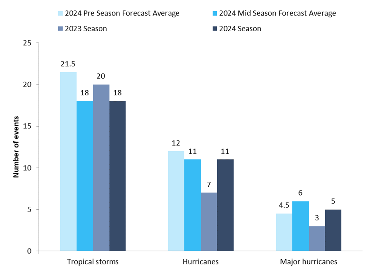 Comparison of the 2024 North Atlantic hurricane season storms to the pre- and mid- season forecast averages of AccuWeather, Colorado State University (CSU), Tropical Storm Risk (TSR), National Oceanic and Atmospheric Administration (NOAA) and North Carolina State University (NCSU) and 2023 season actuals.